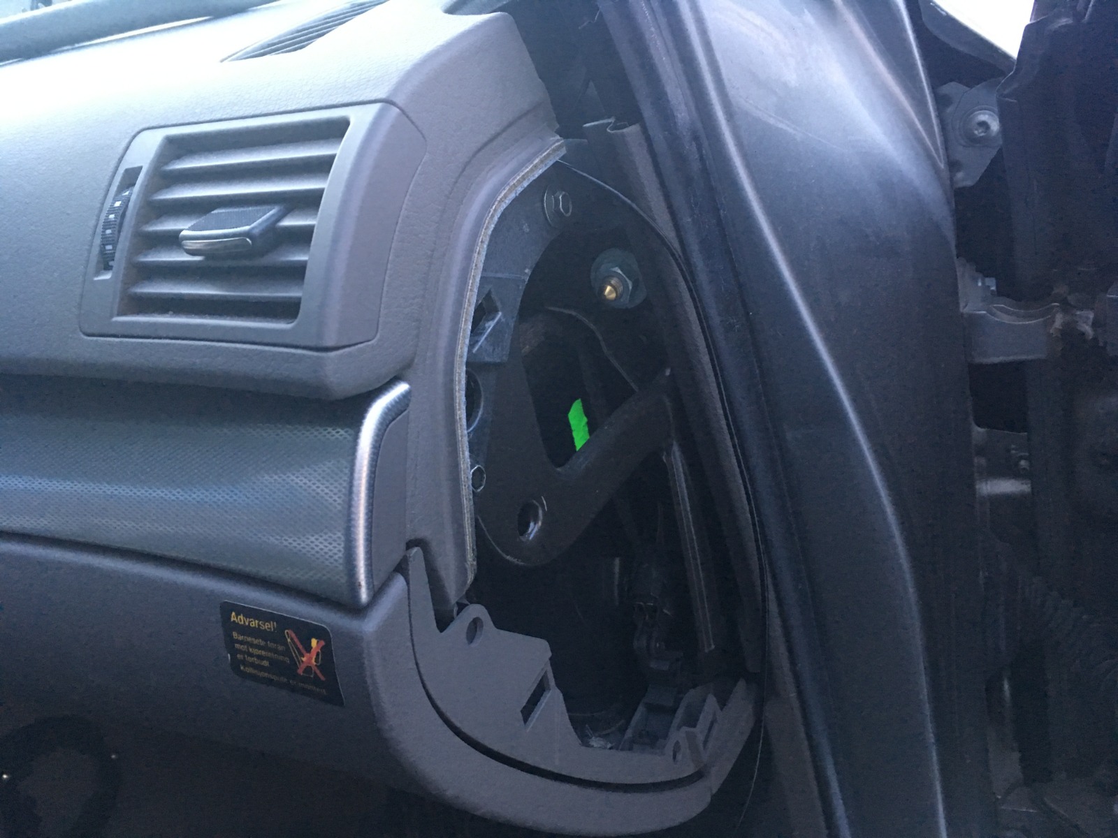 - Løsne a-stople-dekselet på venstre førerside om du skal montere ny radio med blåntann-mikrofon. Bildet viser her demontering av a-stopledekselet på passasjersiden. Airbag-deksel må løsnes med et lite flattjern eller lignende.
