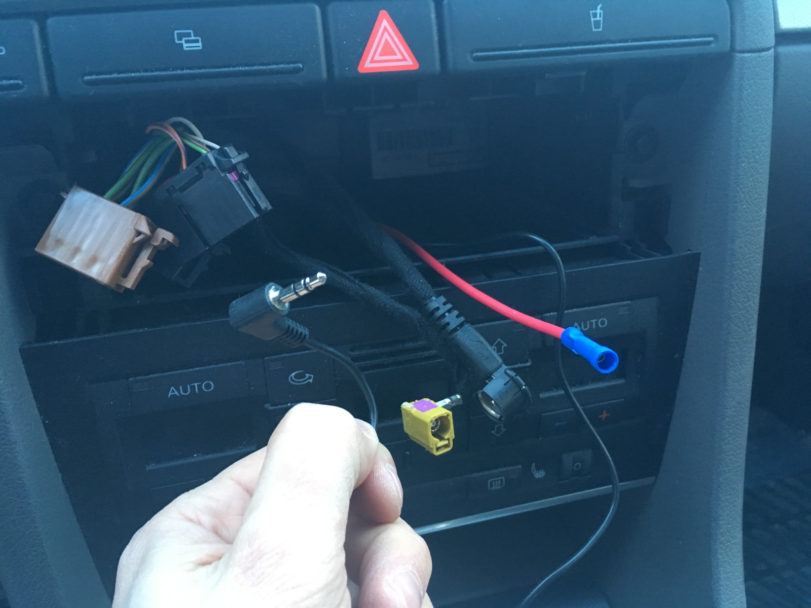 Bilder viser 2.5mm jack for mikrofon og rød tenningskabel fra sikringsskap ferdig trukket frem til radio-lommen