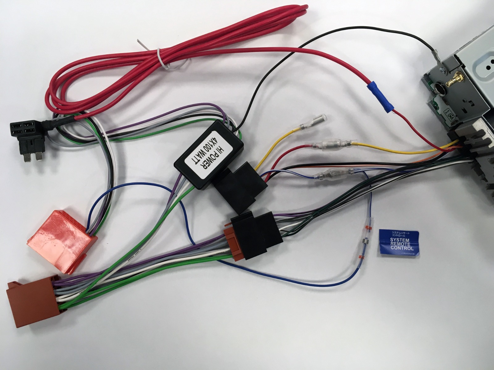 - Blå kabel fra aktivsystem-adapter kobler til blå og hvit ut ifra radioen (12V tenningsstrøm/styrestrøm)