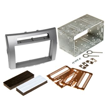 2-DIN radioadapter for å bygge om interiøret i en spesifikk bilmodell til standard DIN-hull slik at man kan montere en valgfri ettermarkedsradio i samme størrelse istedenfor den originalmonterte radioen.